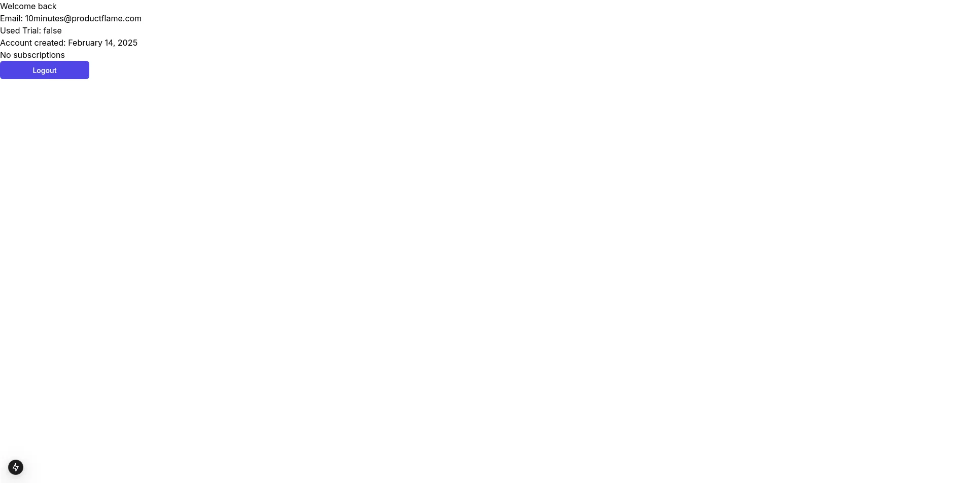 return ( <div> <h1>Welcome back</h1> <p>Email: {email}</p> <p>Used Trial: {usedTrial.toString()}</p> <p>Account created: {dateFormater.format(new Date(created))}</p> <p>{subscriptions.length > 0 ? "Your subscriptions are: " + subscriptions.join(", ") : "No subscriptions"}</p> </div> );}Log Out