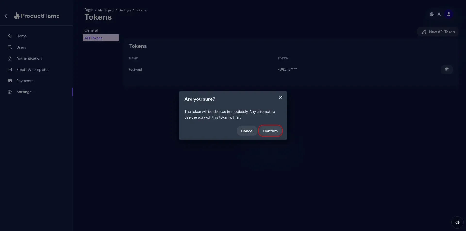 Section titled “Delete Token”You can delete a token from the same place where you created it. Deleting a token will cause it to be invalidated when trying to call the api with it.